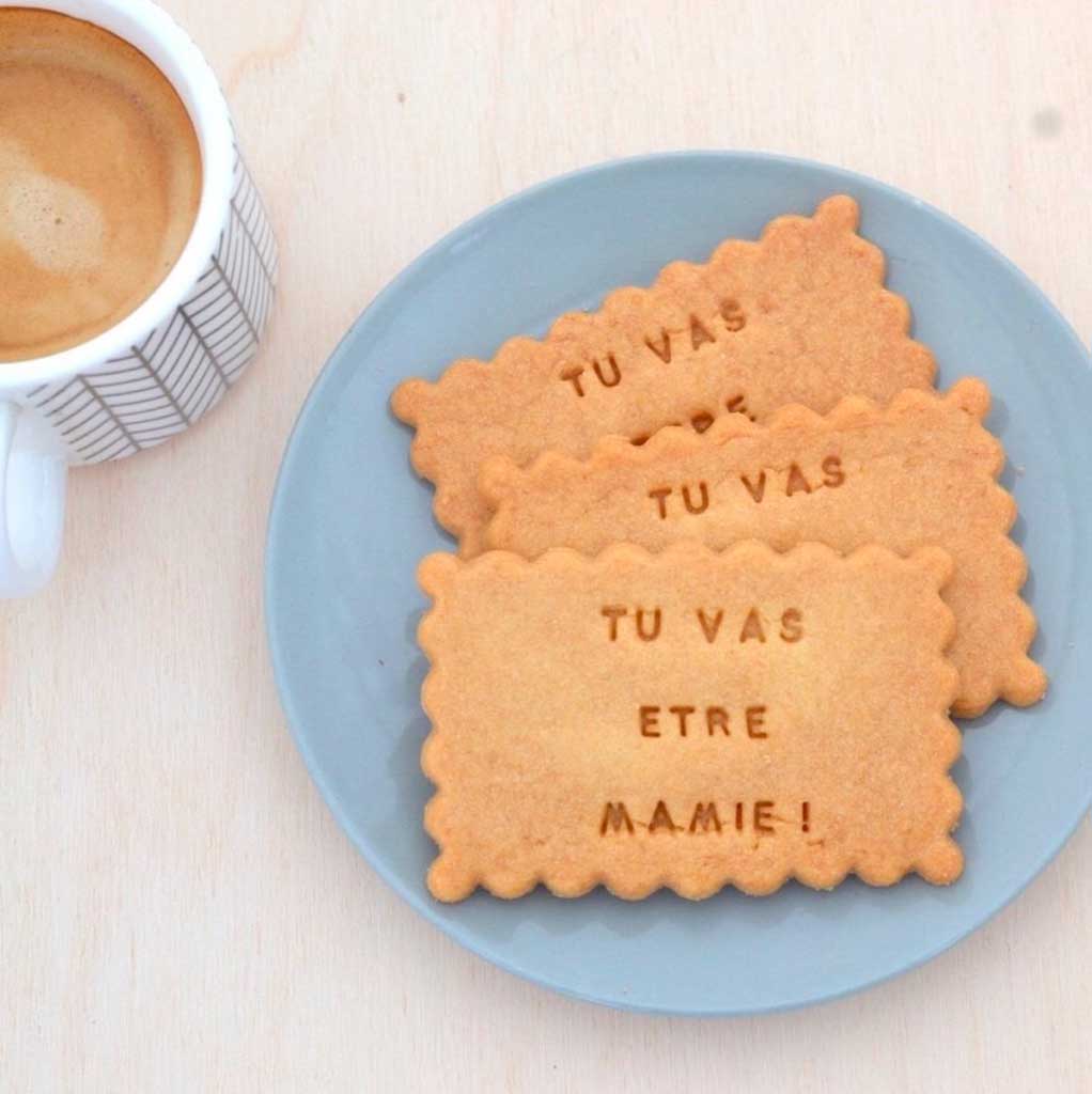 Là aussi, il y a des tas d’idées sur internet ! Peu importe ce que vous choisirez, il y a des tas de messages qui correspondent : “tu vas être papi”, “future mamie gâteau”, etc. On adore cette idée parce qu’en plus d’être simple et de faire passer le message très clairement, vos proches pourront aussi conserver l’objet comme précieux souvenir de ce moment émouvant.