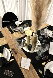 Au niveau de la décoration, pas besoin de vous compliquer la vie ! Avec tout simplement une nappe noire accompagnée de chemin de table en or et un centre de table joliment décoré.