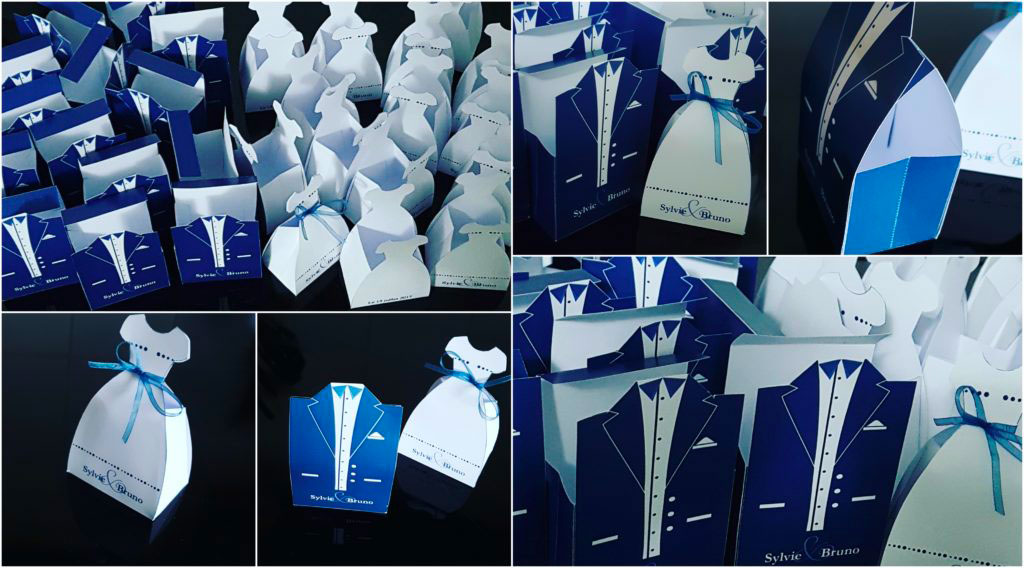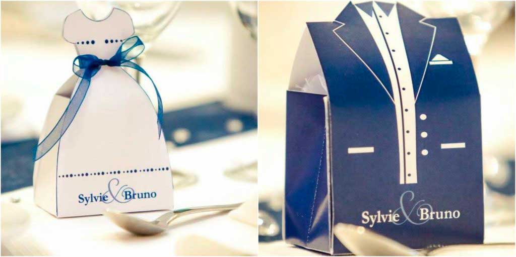 Craquantes et prêtes à être dégustées sur les tables, Sylvie et Bruno ont choisi de sublimer leurs dragées dans de charmantes petites pochettes en organdi. Ensuite glissées dans des boîtes personnalisées : la robe et le costume de mariés.