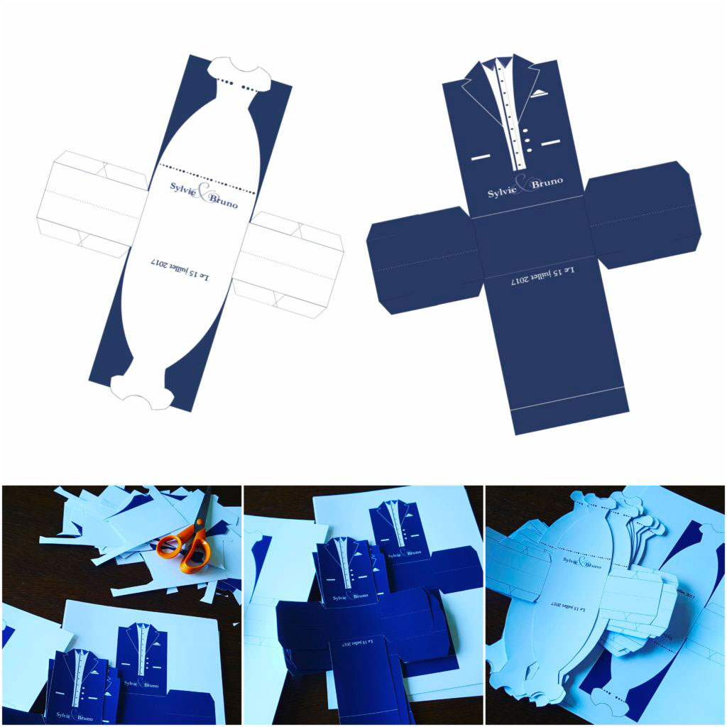 J’ai donc travaillé les gabarits, faits quelques essais, surtout pour choisir le papier, qui doit pouvoir supporter une impression couleur, des découpes et des pliages spécifiques, aux formes de la robe et du costume.
