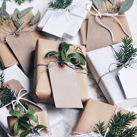 C’est une mode qui est apparue il y a quelques années… Et on adore ! Branche de sapin, de houx ou quelques branches d’eucalyptus peuvent venir égayer vos jolis paquets cadeaux ! Pour rester dans un effet “sobre” et “nature”, on vous conseille d’opter pour un papier kraft.