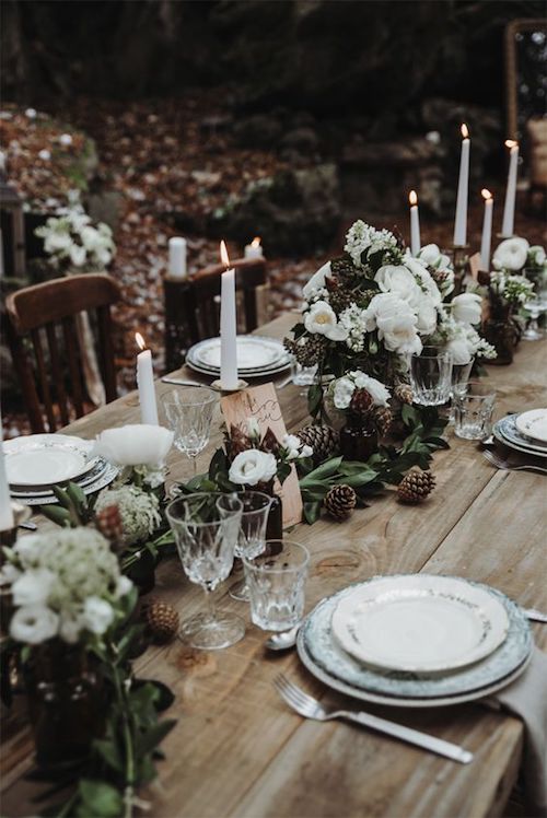 Les matières pourront aussi vous aider à jouer avec l’ambiance. Vous pourrez apporter un peu de chaleur avec du velour, de la fourrure (fausse, s’il vous plait !!!), des nappes épaisses, des gros tapis… Évidemment, le bois est presque un incontournable dans un mariage hivernal, qu’il compose les meubles, la salle de réception, ou quelques éléments de décoration.