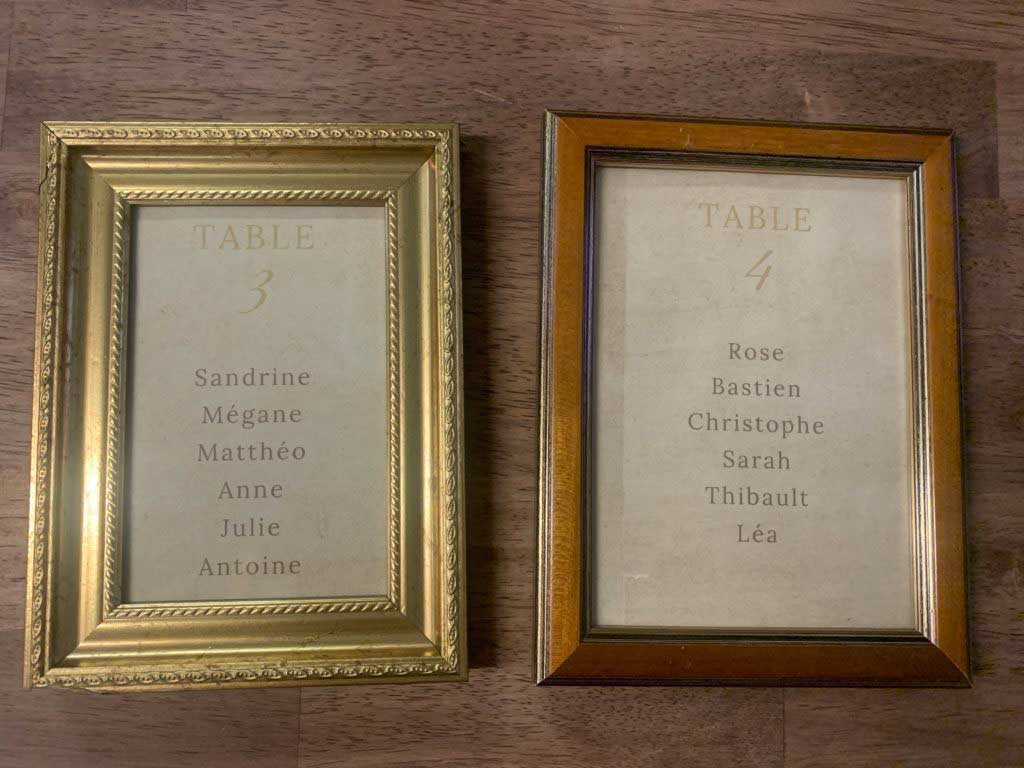 Pour le plan de table, nous avons décidé de mettre chaque élément dans des cadres de formes, tailles, et matières différentes.