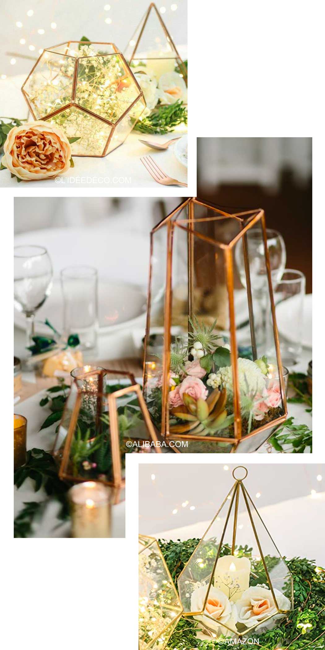 Ça aussi c’est tendance depuis quelques temps… Finie l’utilisation de vases classiques, beaucoup de mariés se tournent vers ces petites structures en verres ornées de fleurs pour habiller leurs centres de table. Simple et efficace !