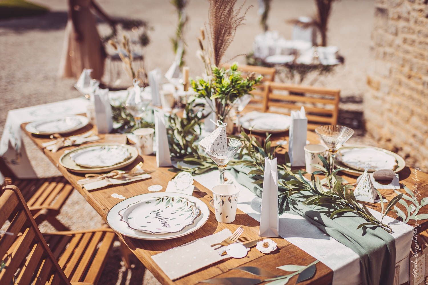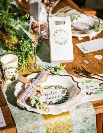 Comme pour un mariage, on profite de ce thème pour se rappeler la beauté de la nature avec des couleurs sobres et des touches de verdure. On hésite pas non plus à utiliser des éléments naturels pour sa décoration : du bois, des feuilles, de la toile de jute…