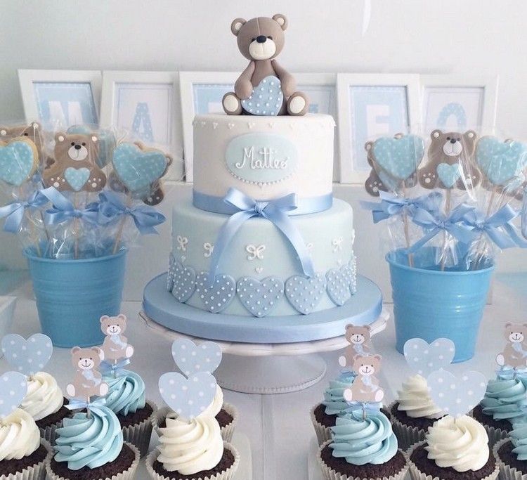 Évidemment, combien de baptême de petit garçon sont réalisés avec cette couleur emblématique ? C’est le thème le plus classique et peut être aussi le moins contraignant tellement il est facile à réaliser en choisissant chaque élément avec la bonne couleur. Évidemment, attention à l’overdose… On vous conseille de jouer avec différentes teintes de bleu pour jouer sur les reliefs et les contrastes, mais aussi d’ajouter un peu de blanc ici et là pour adoucir un peu le rendu final. Et puisque l’on parle des classiques… On peut aussi profiter de ce thème pour ajouter le fameux ours en peluche : sur le gâteau, ou en décoration ici et là !