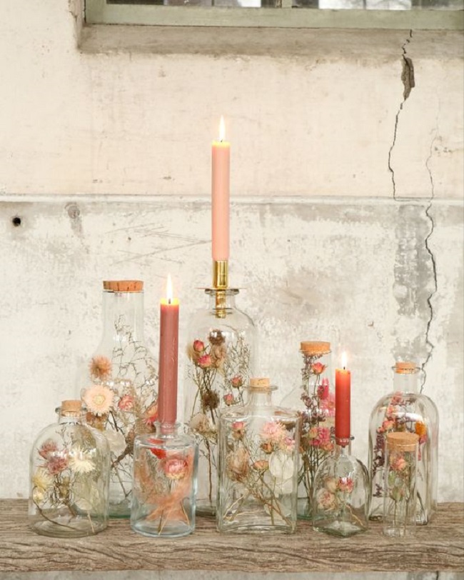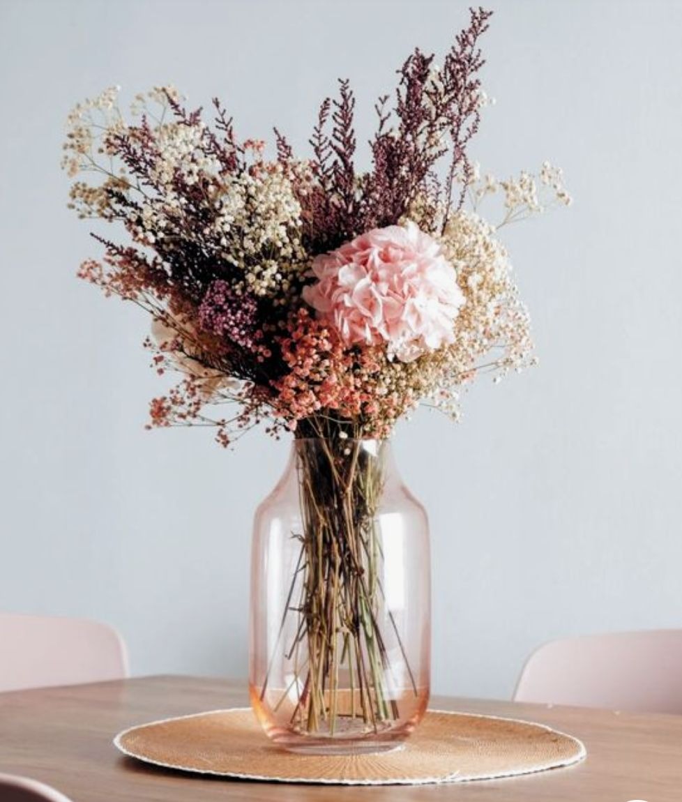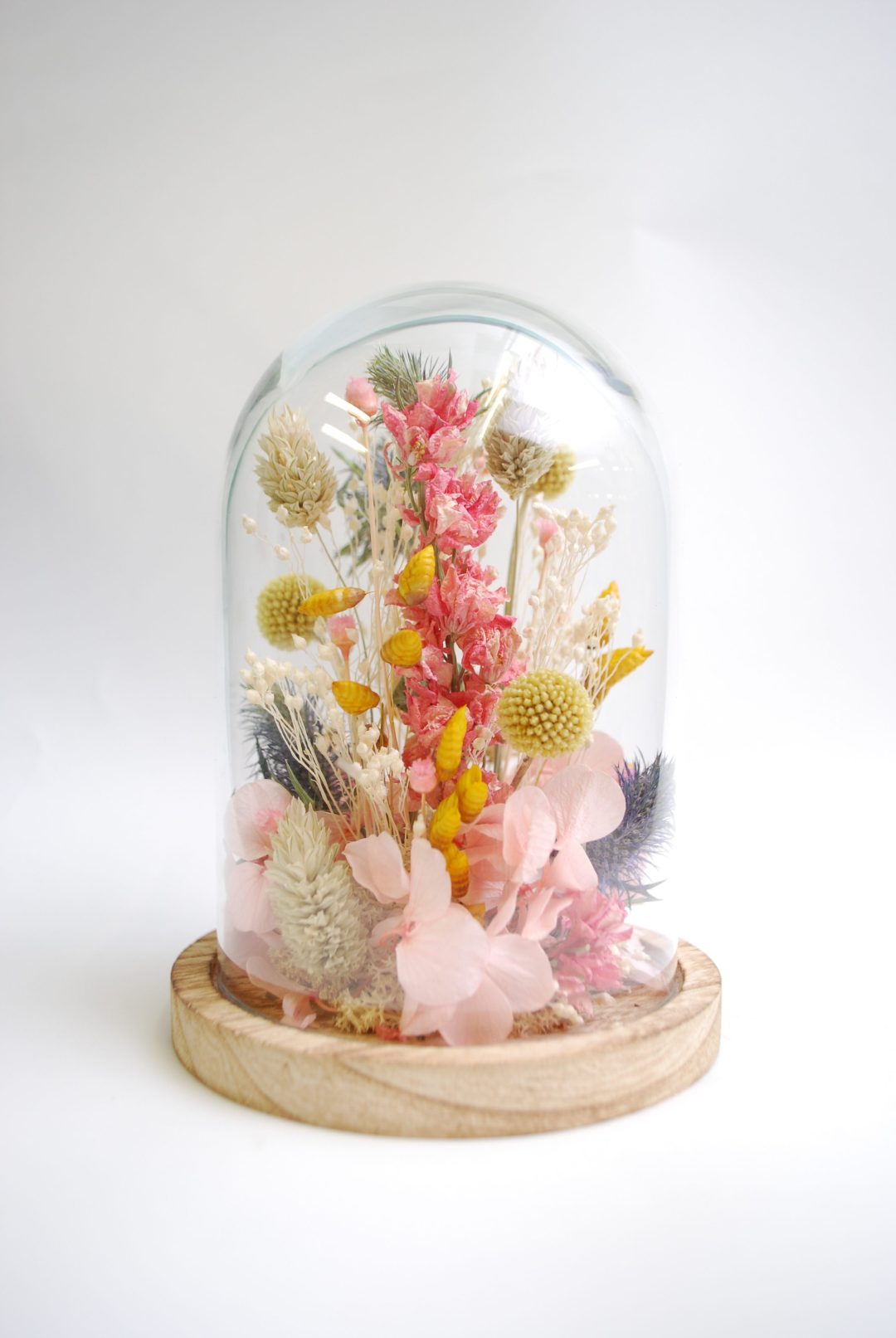Pour un intérieur aux allures bohème, design, romantique ou encore scandinave, la déco fleurs séchées répond présente ! Cette petite touche champêtre s’adapte parfaitement à tous les styles et toutes les pièces. Comment ? Eh bien il y a des dizaines de façon d’intégrer les fleurs séchées à votre décoration ! Une de mes versions préférées, c’est la cloche façon La Belle et la Bête, avec un joli socle en bois et une superbe composition séchée à l’intérieur. Vous pouvez aussi opter pour une composition plus classique dans un beau vase. Vous avez une ancienne carafe pour un style vintage, une célèbre Dame Jeanne ou une vieille bonbonne ? C’est le moment de fouiller vos placards !