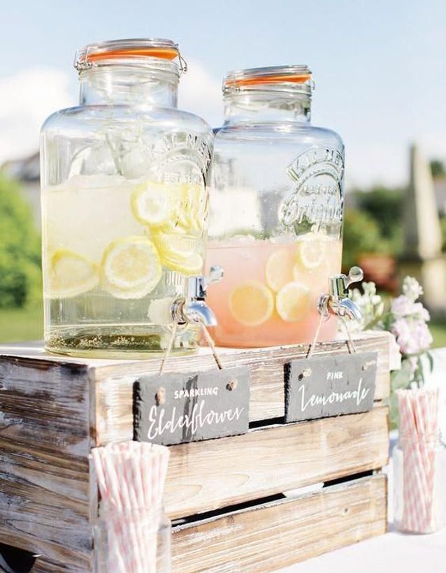 Côté boissons, pensez à des bonbonnes en verre pour servir des jus de fruits ou des limonades de manière élégante et tendance !