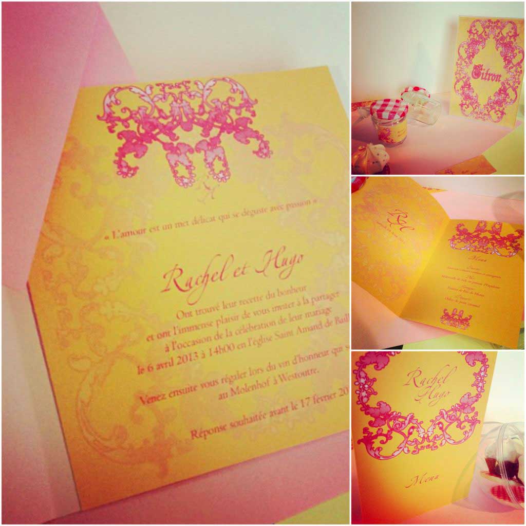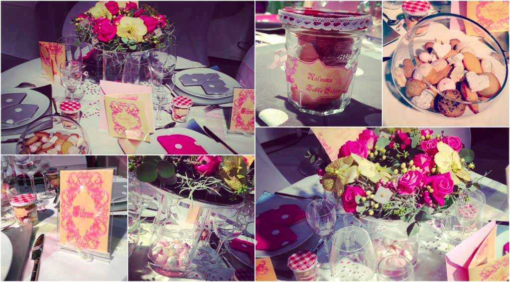 Les cadeaux des invités sont des sablés présentés dans des petits pots de confiture customisés. Et la papeterie est toujours à l’image du faire part de mariage.