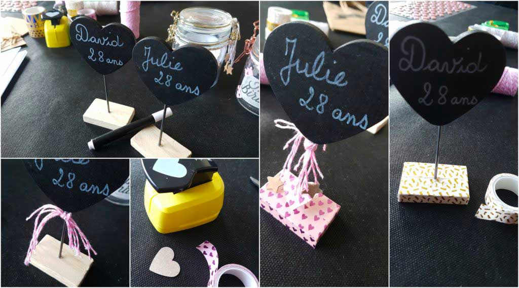 - Découper quelques dizaines de centimètre de baker twine, pour décorer la branche centrale des supports. Et sur cette même branche centrale, glisser un cœur perforé et décoré de masking tape.