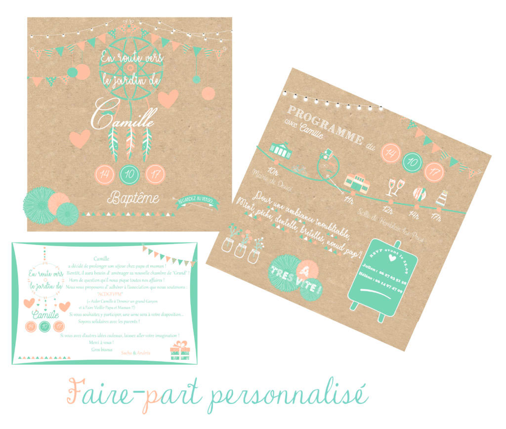 Voici un aperçu du faire-part personnalisé, réalisé par nos soins dans les même tons que la décoration et avec les graphismes choisis par Hélène. Il donne déjà le ton de la fête.