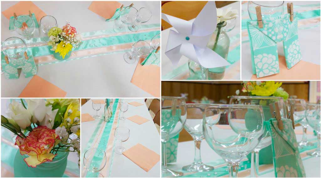 Après plusieurs échanges via messenger, avec Hélène, nous avons déterminé le thème et les couleurs. Nous avons opté pour une décoration dans des tons mint et pêche, emprunte de fraîcheur, de quelques touches vintage et d’un coin champêtre.