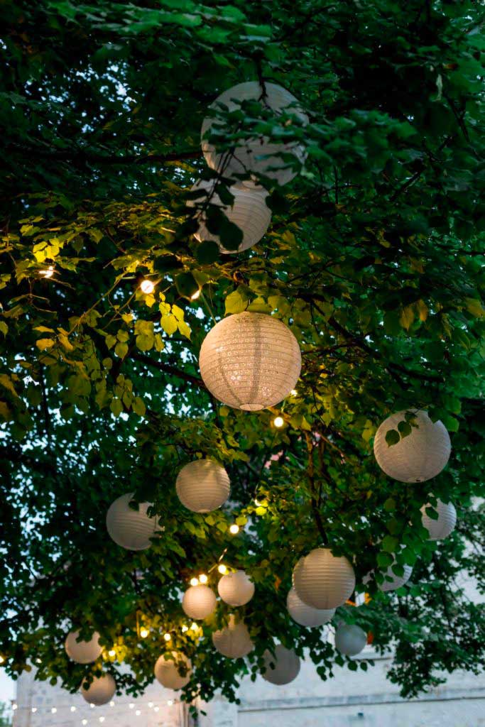 Niveau décoration aérienne, on ne peut que vous conseiller les boules japonaises blanches. Accrochées en solo un peu partout au plafond ou sous un arbre, dont quelques une agrémentées de rubans. Mais également de jolies fleurs suspendues, la décoration champêtre se veut naturelle.