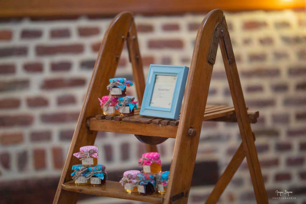 Côté cadeau pour les invités, nous avons pensé à des mini pots de confiture… Un petit bout de tissu découpé par nos soins et un noeud en corde plus tard, voilà de quoi ravir vos invités !