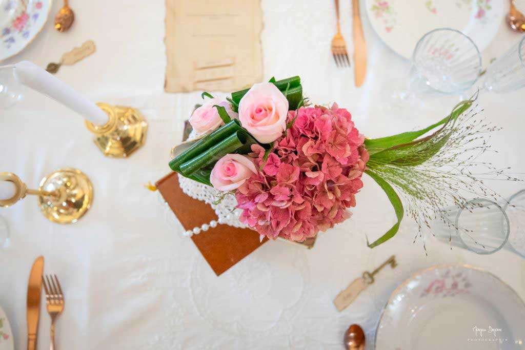 D’ailleurs, les fleurs (qu’on oublie jamais, évidemment !), parlons en. Pourquoi se contenter de vase quand on peut faire bien plus original ? Pour les contenants, nous avons privilégié des éléments… de vaisselle ! Une soupière, une carafe, une théière… Les jolis services en porcelaine d’antan sont parfaits pour sublimer les jolies compositions préparées par Sonia, une de nos plus anciennes partenaires fleuristes avec lesquelles nous aimons toujours beaucoup travailler les inspirations, parce qu’elle n’en manque pas ! N’hésitez pas à aller découvrir sa boutique Anaïs Fleurs à Wattignies, vous y serez toujours agréablement reçus.