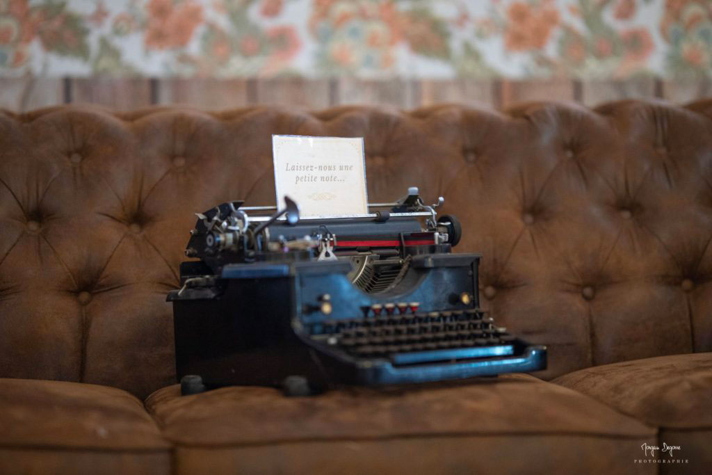 Nous avons aussi décidé de placer le coin voeux à cet endroit et pour ça, nous avons trouvé LA pièce vintage… La machine à écrire ! Accompagné de son petit message laissé à l’intention des invités, c’est l’élément parfait, non seulement pour une déco vintage, mais aussi pour ce coin où vos convives doivent justement vous écrire…