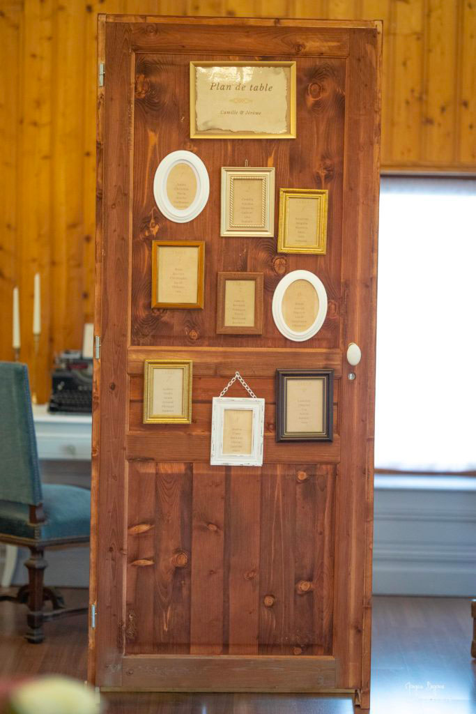 Parlons plan de table : pour ça, nous avons décidé d’utiliser une porte. Si vous avez la chance d’en dénicher une en brocante ou dans un vieux grenier, régalez-vous ! Sinon, vous pouvez aussi acheter une porte simple et la travailler pour la vieillir… C’est exactement ce que nous avons fait. Après avoir vieilli le bois pour donner à la porte un aspect plus brut et ancien, nous avons déniché un tas de vieux cadre de couleurs, matières et formes différentes pour constituer le plan de table… Et voilà le résultat !