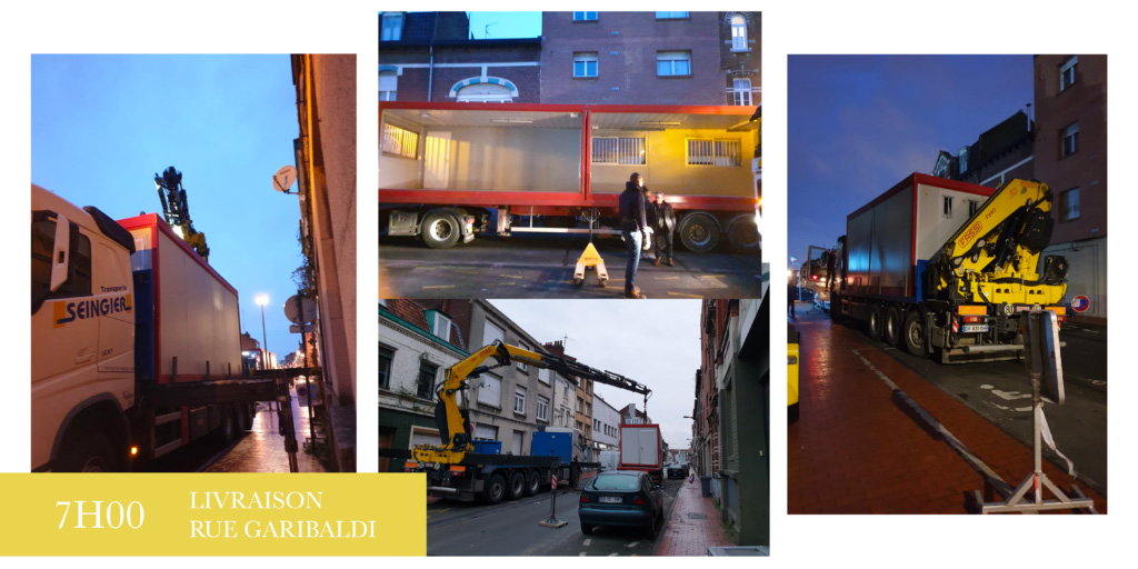 Cinq bungalows ont été achetés à une boîte de bâtiments et le reste de l’équation est très simple : une société de transport spécialisée + une grue + 2 arrêtés municipaux + un gros chantier + un blocage complet de la rue Garibaldi à 7h00 du matin… = nos nouveaux bureaux installés à midi au sein de l’entrepôt !