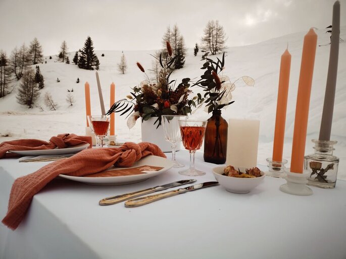 Côté couleurs, vous pouvez opter pour du blanc pour rappeler la neige mais aussi d’autres couleurs chaudes. Vous pouvez ajouter encore un peu de chaleur grâce à des bougies et un éclairage tamisé. Votre lieu de réception possède une cheminée ? C’est l’occasion parfaite pour l’allumer !