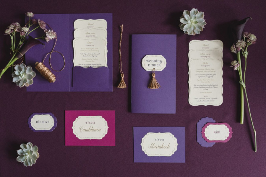 Pour une décoration de mariage orientale vous devrez bien entendu avoir des tables inspirées de l’Afrique du Nord. Avec de jolies nuances de couleurs violet, orange, rouge, pourpre afin que vos invités se croient dans un conte des 1001 nuits tout au long de la soirée. Sans oublier d’accorder la papeterie de vos tables à celle de votre faire-part.