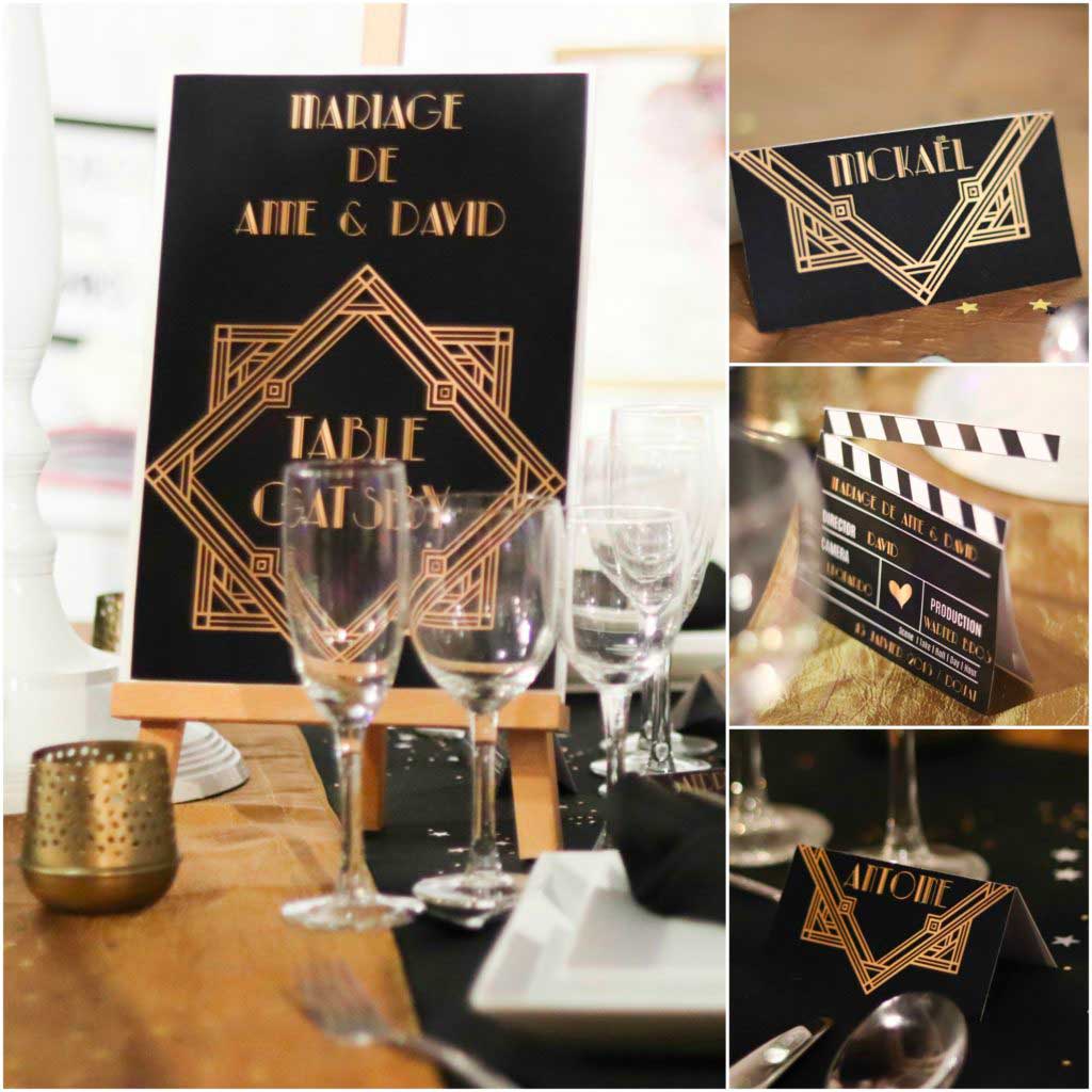 En plus, cette déco originale peut également inspirer les fans de cinéma, de cabaret, et de charleston. Puisqu’on y retrouve les mêmes codes couleurs et les mêmes accessoires fantaisies : le noir, le doré, les plumes et les paillettes. Les touches de blanc éclaircissent l’ensemble. Puis les lignes et la géométrie typiques et élégantes du style art déco des années folles se retrouvent dans la papeterie personnalisée prévue : sur les marques places, sur le menu et sur le nom de table.
