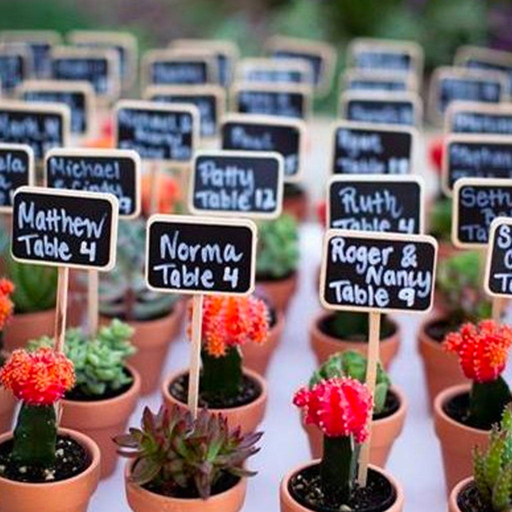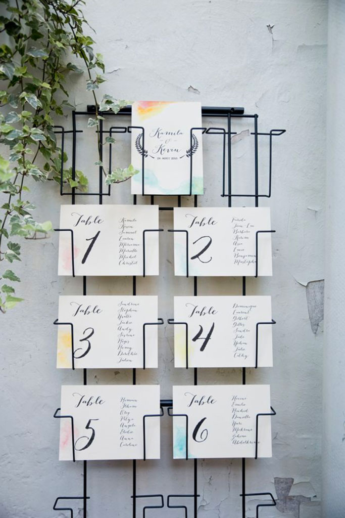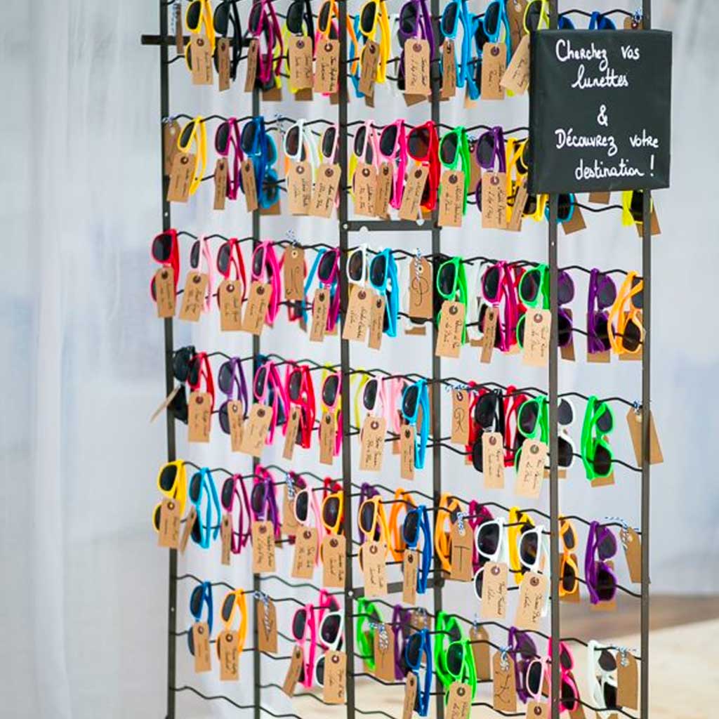 Nous, on adore l’idée des lunettes de soleil, surtout si votre cérémonie se déroule à l’extérieur, en plein été… Disposez des lunettes de soleil de différentes couleurs : chaque couleur indique à vos convives la table où ils pourront dîner !