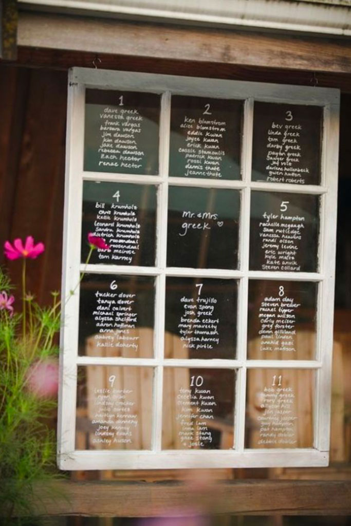 Avec plaisir, si vous insistez ! Et pourquoi pas récupérer une vieille fenêtre dans le grenier de mamie ? Chaque carreau devient une table où vous pouvez inscrire les prénoms de vos invités avec un stylo blanc prévu à cet effet… Ou alors un porte cartes ? Au top des tendances depuis quelques années, il devient le support idéal pour créer un plan de table original (si vous trouvez un porte-cartes en tourniquet, c’est encore mieux !!)