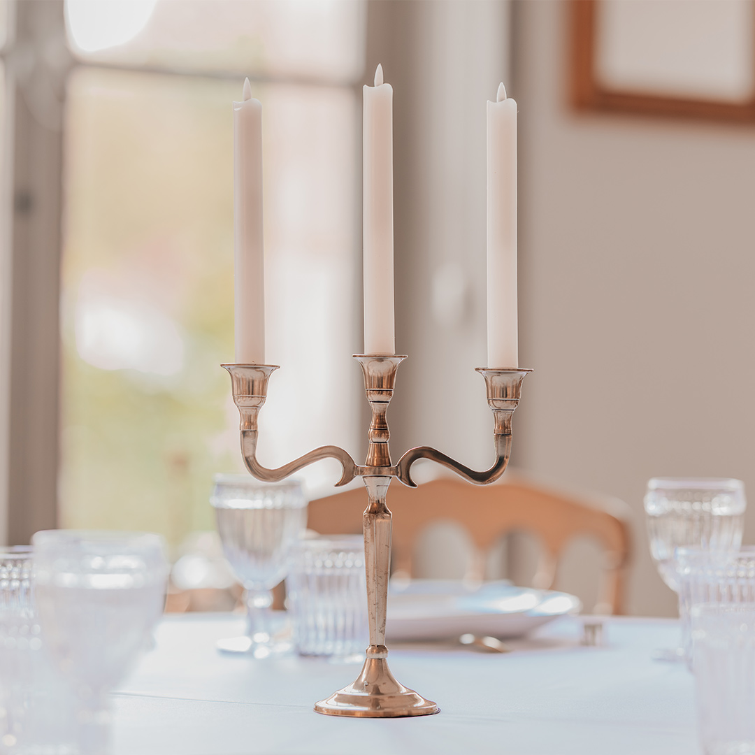 Idéal pour accueillir des bougies effilées, il diffuse une lumière douce et chaleureuse, créant une ambiance romantique et feutrée. Compact et harmonieux, il s’adapte aussi bien aux mariages classiques qu’aux décors plus modernes ou bohèmes, ajoutant une note précieuse et élégante à chaque mise en scène.