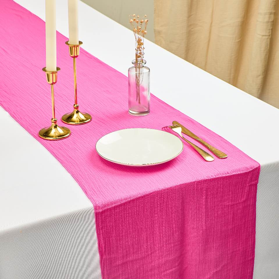 Apportez une touche de chaleur et d’audace à vos événements avec notre chemin de table en gaze de coton fuchsia profond. Sa matière douce et légèrement texturée crée un effet chaleureux et captivant, parfait pour mettre en valeur votre décoration. Idéal pour les mariages, réceptions ou tout autre événement spécial, ce chemin de table apportera une ambiance vive et élégante à votre décoration.