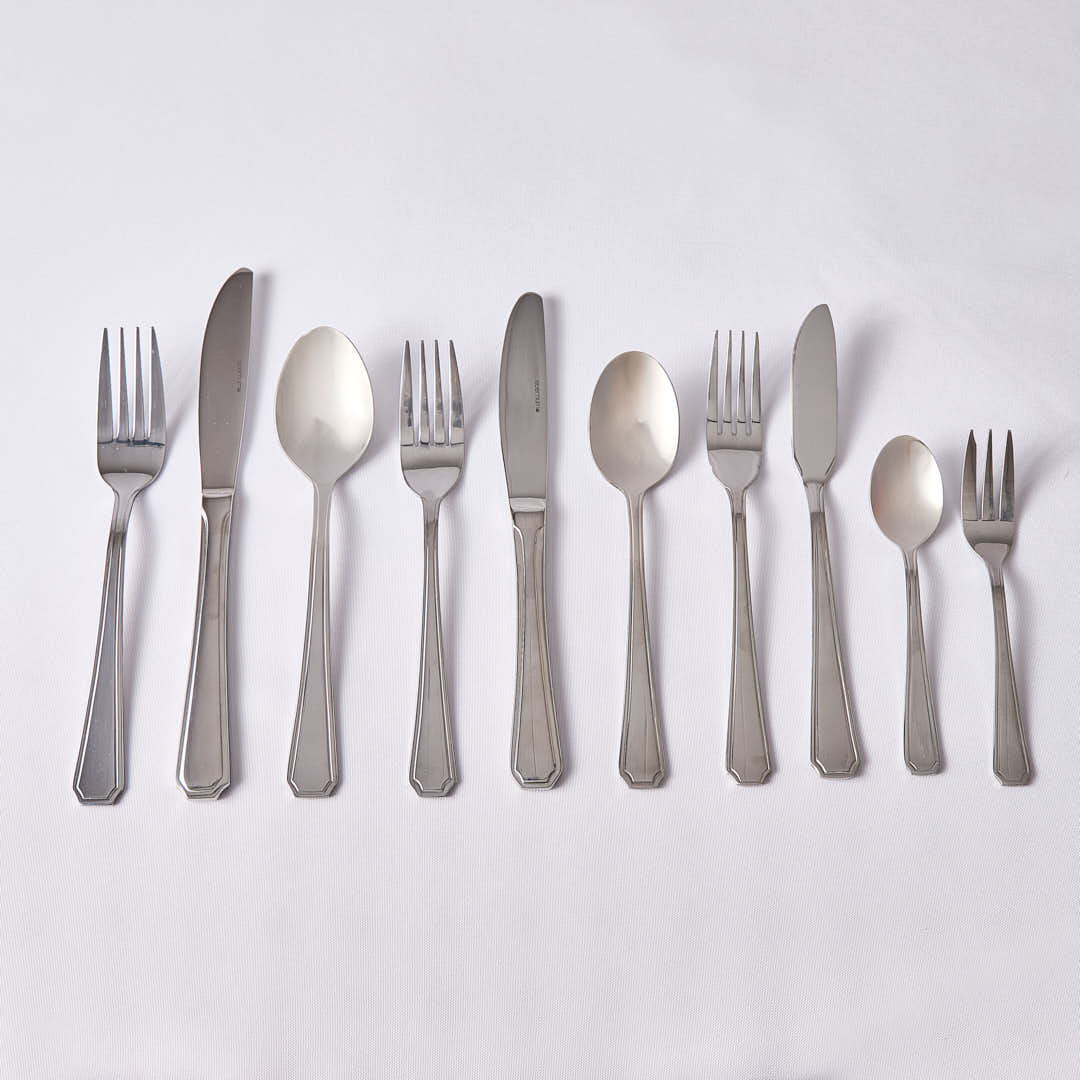 Découvrez les couverts «Élégance» : la gamme complète pour vos événements avec : fourchette, couteau, cuillère à soupe ; fourchette, cuillère et couteau entremets ; fourchette et couteau à poisson.