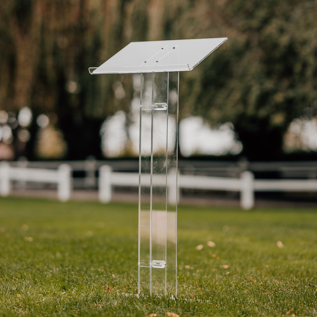 Ce pupitre en plexiglas, léger et pratique à transporter, sera idéal pour vos cérémonies laïques ou vos conférences. Discret, il convient à une large variété de thèmes. Son apparence transparente lui confère un style minimaliste pouvant agrémenter tous types de décorations, qu’elle soit glamour ou encore moderne.