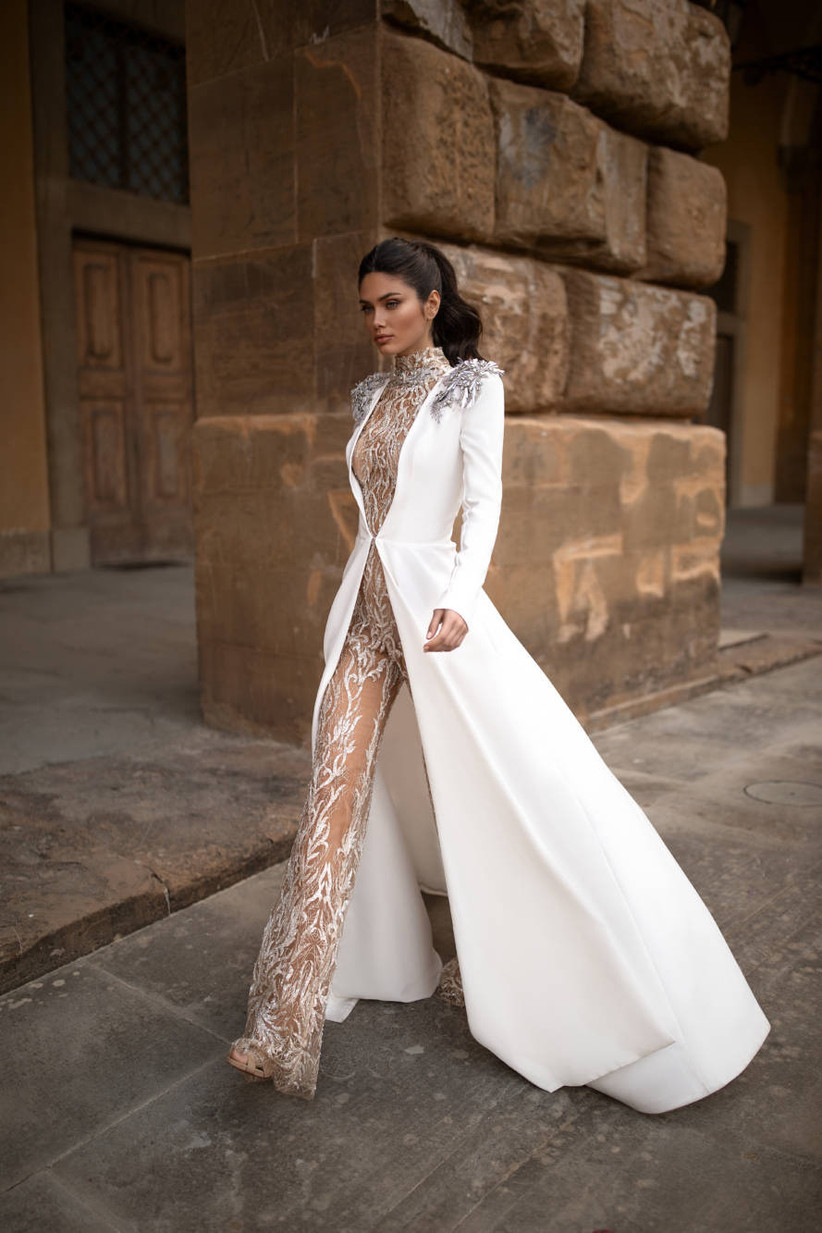Oui, oui, vous avez bien lu ! Si vous êtes une pro des tendances, comme nous, vous n’avez pas pu passer à côté de celle-ci ! La robe pantalon est LA star des robes de mariées originales : les pantalons, shorts et autres combinaisons envahissent de plus en plus les défilés des créateurs et plaisent à de nombreuses mariées qui n’ont pas peur de casser les codes ! Alors cette tendance risque fort d’étonner un grand nombre de vos invités… Mais nous, on est complètement fan !!