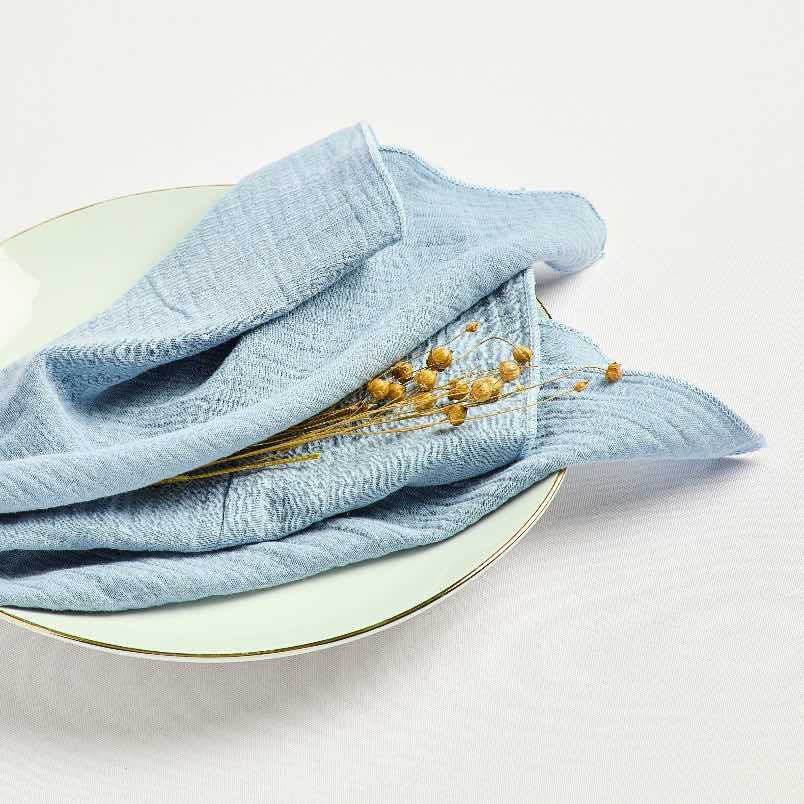 Ajoutez une note de douceur et de sophistication à vos événements avec nos serviettes en gaze de coton bleu dusty. Idéales pour les mariages, les dîners intimes, les fêtes de famille ou tout autre événement spécial, ces serviettes apportent une ambiance naturelle et élégante à votre décoration de table.