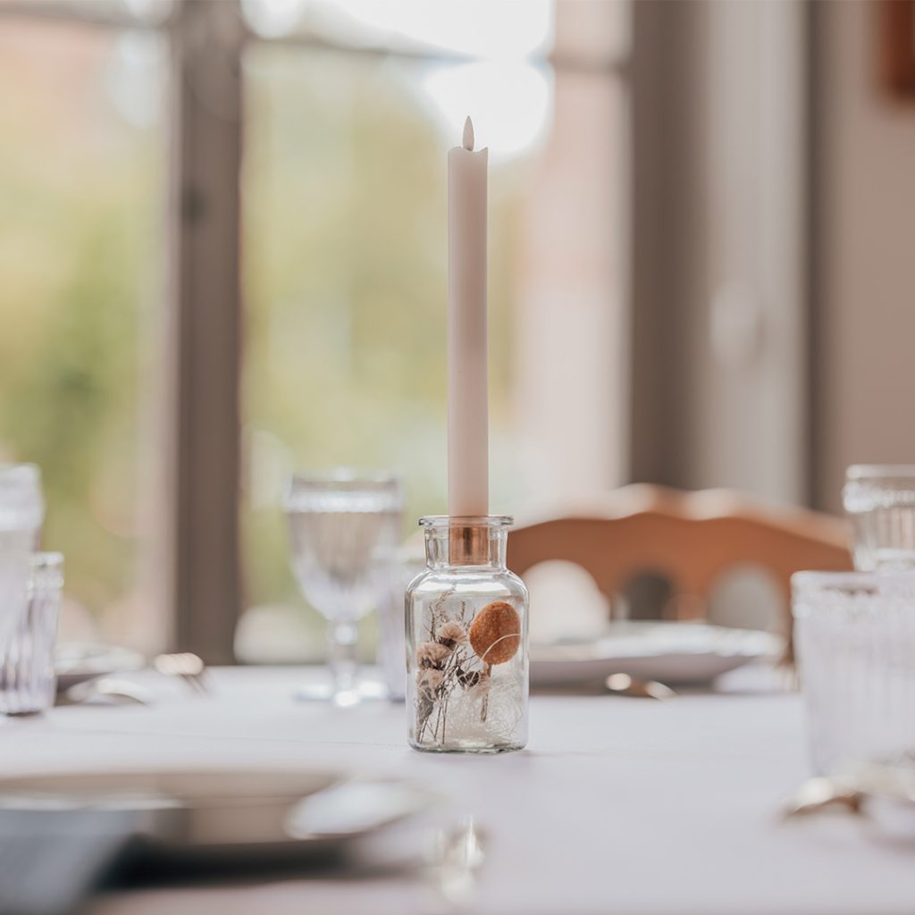 Les bougeoirs à fleurs séchées sont le détail parfait pour sublimer une décoration de mariage. Leur charme naturel et intemporel s’intègre harmonieusement dans une ambiance romantique, champêtre ou bohème. Placés sur les centres de table, le long de l’allée nuptiale ou sur le buffet, ils diffusent une lumière douce et chaleureuse.