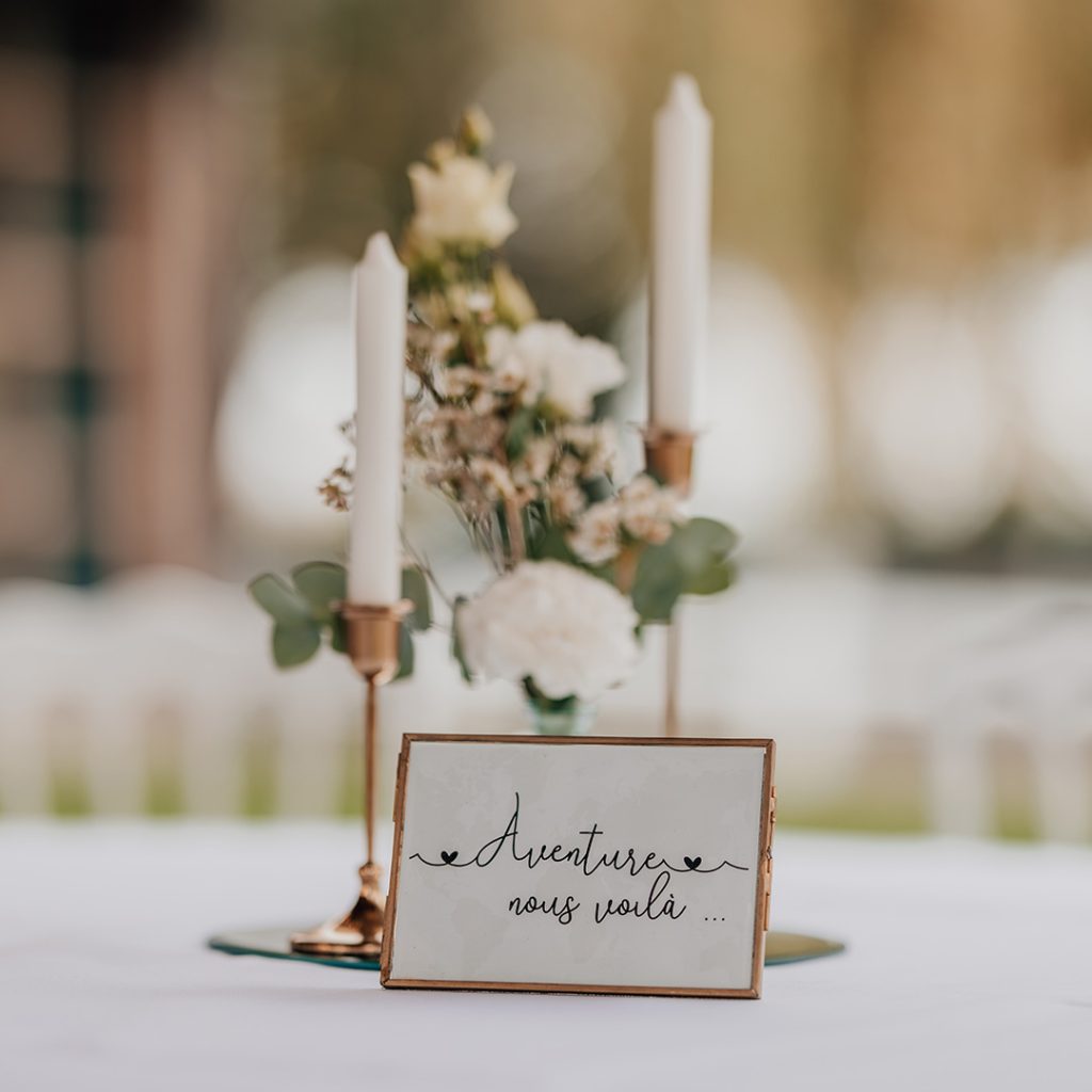 Ce cadre doré est une invitation au voyage et aux nouveaux départs. Avec l’inscription “Aventure, nous voilà…“, il symbolise l’excitation d’un futur à construire à deux, rempli de découvertes et de moments inoubliables. Son design raffiné et sa finition dorée en font un élément de décoration élégant, idéal pour un mariage placé sous le signe du voyage, mais aussi pour toute occasion célébrant un tournant important.