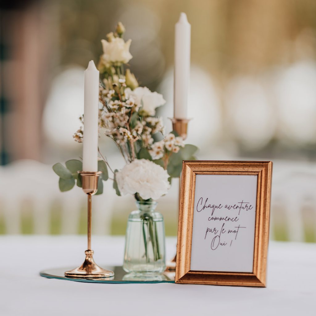 Ce cadre doré élégant est bien plus qu’un simple élément de décoration : il porte en lui une promesse, celle d’un nouveau départ. Avec l’inscription “Chaque aventure commence…“, il évoque le voyage, l’amour et toutes les belles étapes à venir. Son design raffiné et sa finition dorée en font une pièce idéale pour un mariage sur le thème du voyage, mais aussi pour toute célébration marquant un renouveau.