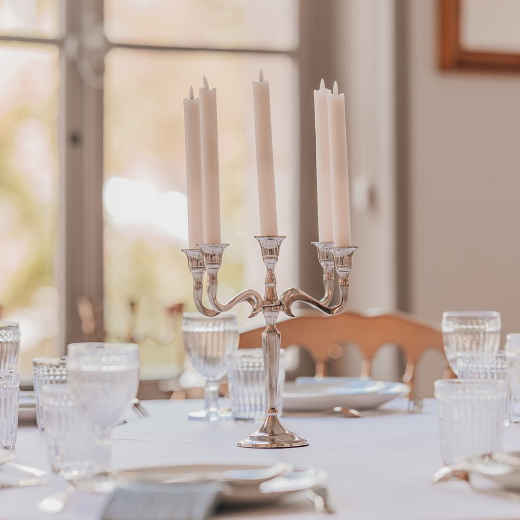 - Des bougeoirs ou chandeliers argentés pour une lumière douce et chaleureuse