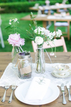 Puis pour vos décorations de tables bohèmes, n’hésitez pas à utiliser des bouteilles en verre, pour qu’elles vous servent de vases lors du jour J. De simples bouteilles transparentes feront l’affaire ! Les sublimer est un jeu d’enfant, il suffit d’un simple ruban.